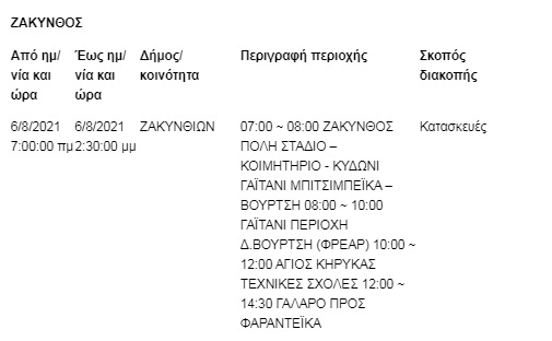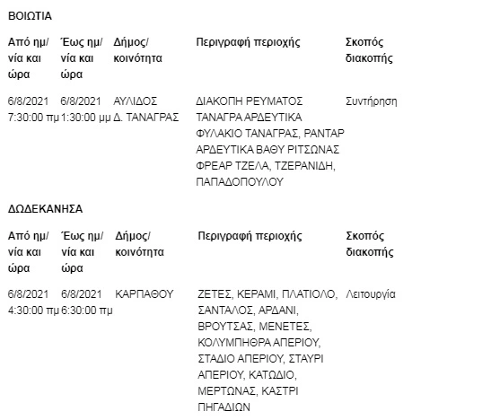 Διακοπές ρεύματος θα πραγματοποιηθούν σήμερα Παρασκευή 6 Αυγούστου, σε αρκετές περιοχές της χώρας, όπως ανακοίνωσε ο ΔΕΔΔΗΕ.