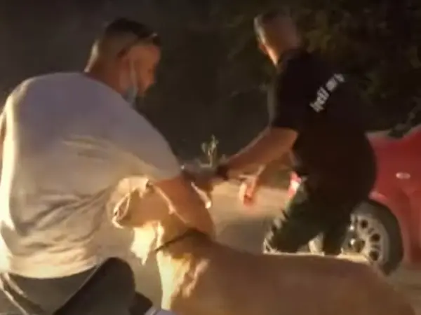 Οι δυο νεαροί εθελοντές μπήκαν και έσωσαν το ζώο και προσπάθησαν να το ηρεμήσουν και να το δροσίσουν με μπουκαλάκια νερό που είχαν μαζί τους.