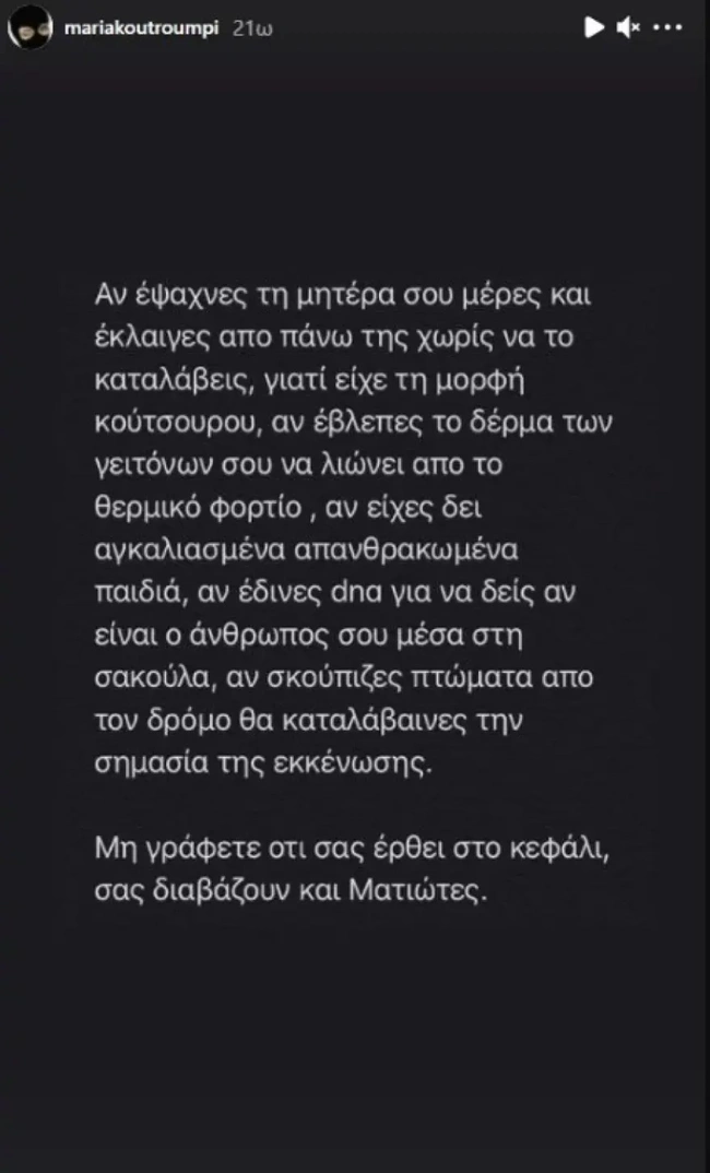 «Αν έψαχνες τη μητέρα σου μέρες και έκλαιγες από πάνω της χωρίς να το καταλάβεις, γιατί είχε τη μορφή κούτσουρου, αν έβλεπες το δέρμα των γειτόνων σου να λιώνει από το θερμικό φορτίο, αν είχες δει αγκαλιασμένα απανθρακωμένα παιδιά, αν έδινες DNA για να δεις αν είναι ο άνθρωπός σου μέσα στη σακούλα, αν σκούπιζες πτώματα από τον δρόμο, θα καταλάβαινες τη σημασία της εκκένωσης. Μη γράφετε ό,τι σας έρθει στο κεφάλι, σας διαβάζουν και Ματιώτες», έγραψε χαρακτηριστικά η Μαρία Κουτρουμπή, εκφράζοντας την αγανάκτησή της.