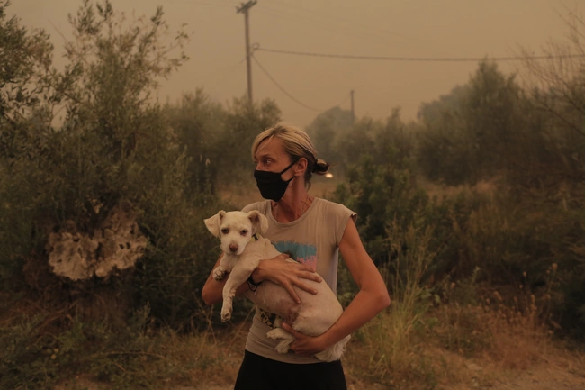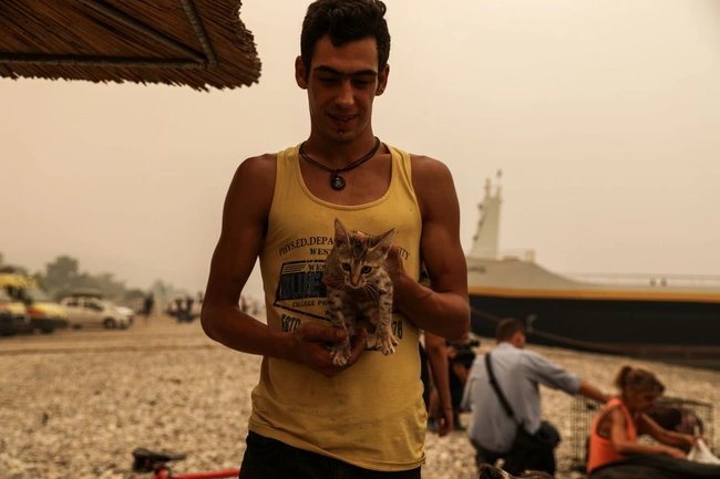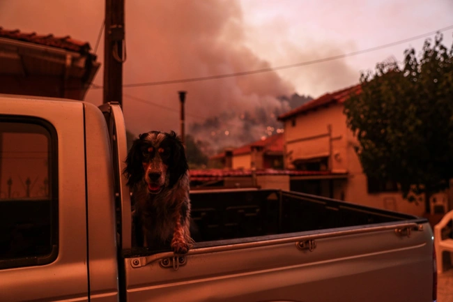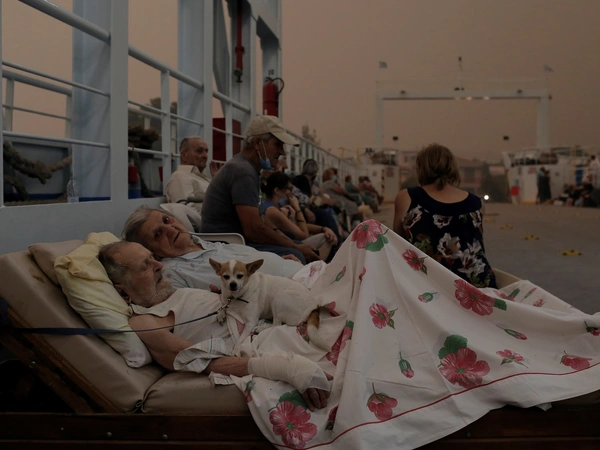 Γλυκόπικρο στιγμιότυπο στην Εύβοια που ζει την απόλυτη οδύνη από τις φωτιές: Ο Γεώργιος Λιάκος 89 ετών και η σύζυγός του Παρισσώ Λιάκου 87 ετών, κάτοικοι του χωριού Πευκί, περιμένουν μαζί με το σκυλάκι τους τη Μπέλα, στο κατάστρωμα ferry boat αφού το χωριό τους φλέγεται. Μια βαθιά τρυφερή στιγμή, σε ένα πολύ σκληρό σκηνικό.