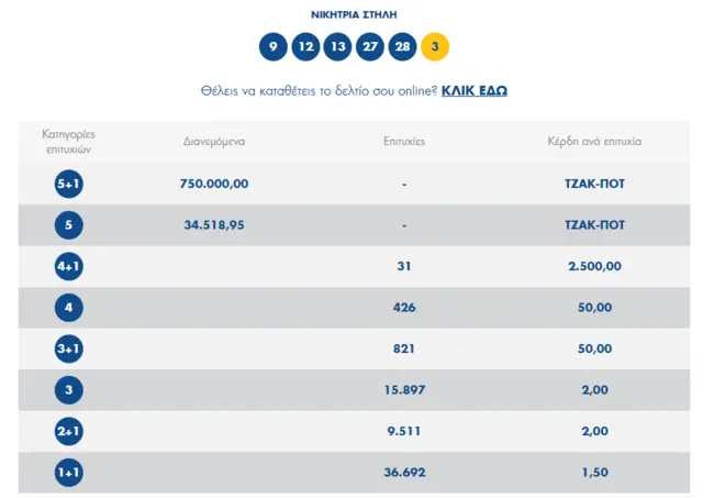 Οι τυχεροί αριθμοί στη σημερινή κλήρωση Τζόκερ είναι οι εξής: 9, 12, 13, 27, 28 και τζόκερ ο αριθμός 3