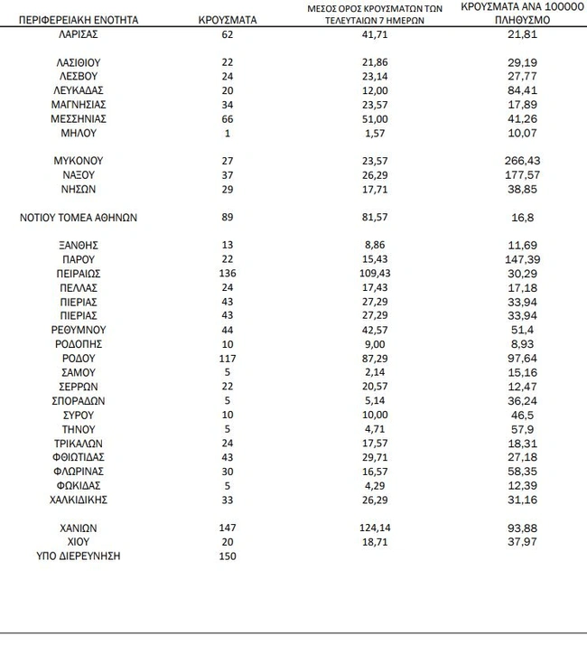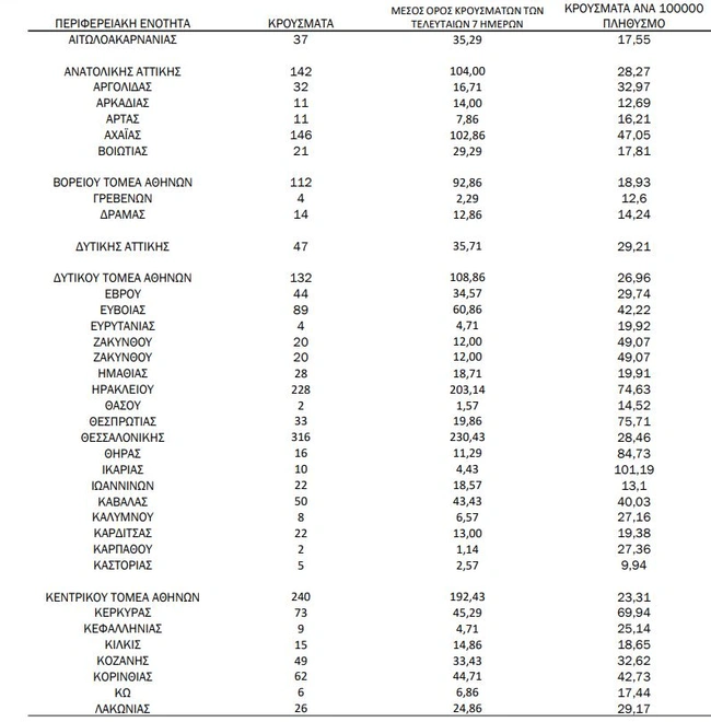 Αναλυτικά τα κρούσματα σε όλη την Ελλάδα:
