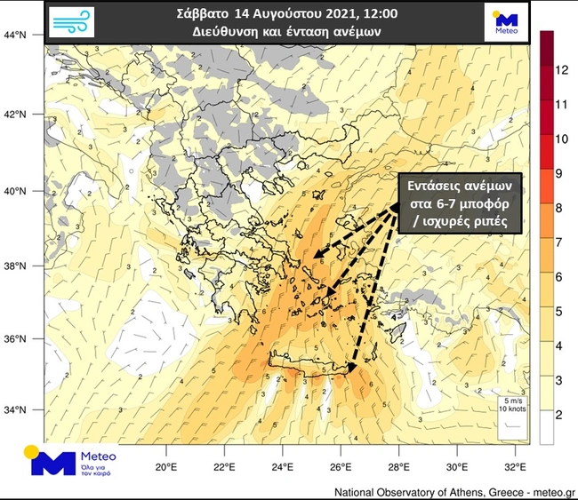 Ενίσχυση θα παρουσιάσουν οι βόρειοι άνεμοι στο Αιγαίο και στα ανατολικά παραθαλάσσια τμήματα της χώρας σήμερα, με αποτέλεσμα να είναι αυξημένος ο κίνδυνος εξάπλωσης δασικών πυρκαγιών σε αυτές τις περιοχές. Σύμφωνα με τα προγνωστικά στοιχεία του Εθνικού Αστεροσκοπείου Αθηνών/meteo.gr, το Σάββατο οι εντάσεις των βοριάδων στο Αιγαίο θα φτάσουν τα 6 και τοπικά τα 7 μποφόρ.