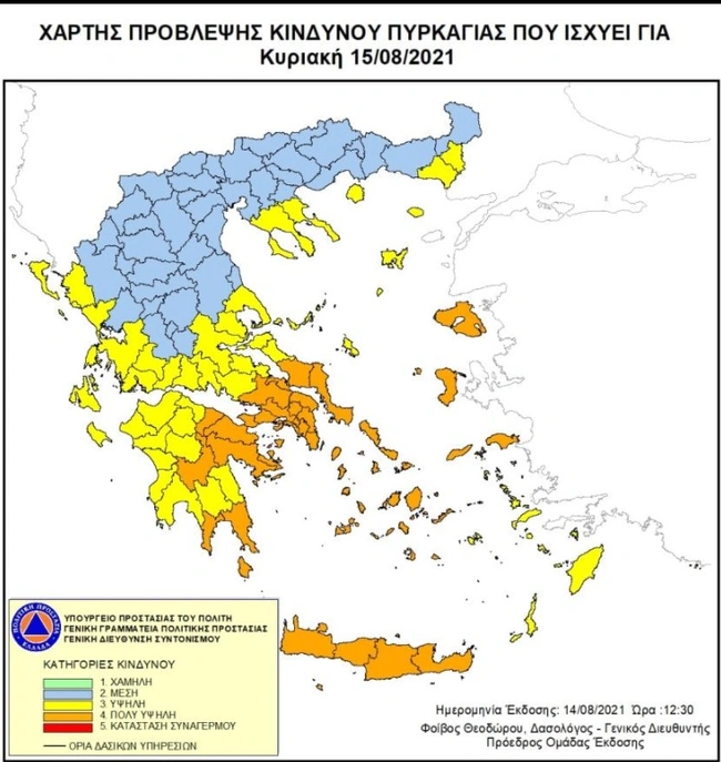 Πολύ υψηλός κίνδυνος πυρκαγιάς (κατηγορία κινδύνου 4) προβλέπεται και για σήμερα, Κυριακή 15 Αυγούστου 2021, στην Εύβοια, στην Αττική, στην Βοιωτία, στην Πελοπόννησο, στην Κρήτη και στα νησιά του Αιγαίου, σύμφωνα με το Χάρτη Πρόβλεψης Κινδύνου Πυρκαγιάς που εκδίδει η Γενική Γραμματεία Πολιτικής Προστασίας.