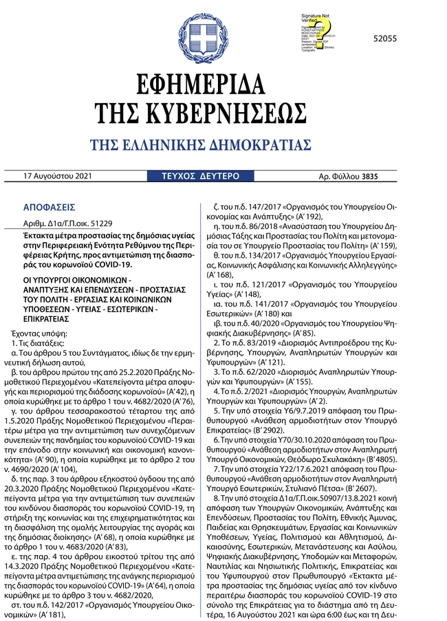 Τα έκτακτα μέτρα προστασίας, που δημοσιεύθηκαν στο ΦΕΚ τα ξημερώματα, έχουν διάρκεια ως και την Τετάρτη 25 Αυγούστου. Στις περιφερειακές ενότητες Ηρακλείου και Χανίων, τα περιοριστικά μέτρα παρατείνονται, επίσης, ως και την Τετάρτη, 25 Αυγούστου 2021 και ώρα 06:00.