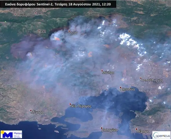 Κάηκαν 75.000 στρέμματαΕικόνες θλίψης με τη φωτιά να κατακαίει και στα Βίλια εδώ και τρεις μέρες. Τις εικόνες με την πύρινη λαίλαπα να «καταπίνει» το δάσος κατέγραψε το μεσημέρι της Τετάρτης ο δορυφόρος Sentinel-2. Οπως μπορείτε να δείτε και από τη φωτογραφία που παρουσιάζει το meteo.gr, στην εικόνα αυτή φαίνονται με κόκκινες και πορτοκαλί αποχρώσεις οι εκτιμήσεις για τα ενεργά μέτωπα της φωτιάς καθώς και ο καπνός από αυτή. Ο πυκνός καπνός καθιστά την προσπάθεια εκτίμησης της καμένης έκτασης δύσκολη και αυξάνει την πιθανότητα λάθους. Με επιφύλαξη που σχετίζεται με την παρουσία του πυκνού καπνού, η εκτίμηση του Εθνικού Αστεροσκοπείου Αθηνών / meteo.gr, για το μέγεθος της καμένης έκτασης έως το μεσημέρι της Τετάρτης είναι τα 75.000 στρέμματα.
