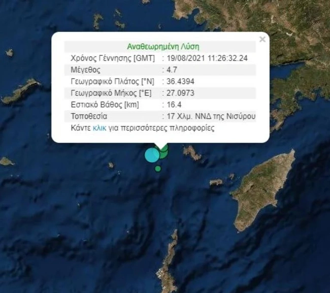 Μετά από 20 λεπτά από την πρώτη δόνηση, ένας νέος σεισμός σημειώθηκε στη Νίσυρο. Η δόνηση εκδηλώθηκε στην περιοχή στις 14:26 της Πέμπτης 19 Αυγούστου και είχε μέγεθος 4,7 Ρίχτερ.