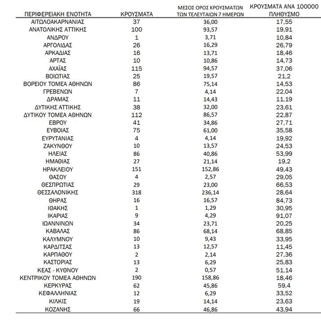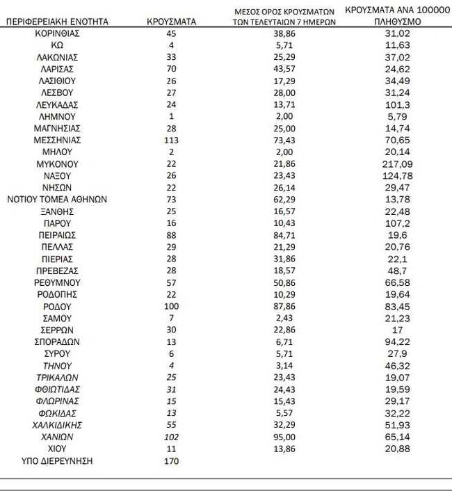 Αναλυτικά τα κρούσματα σε όλη την Ελλάδα