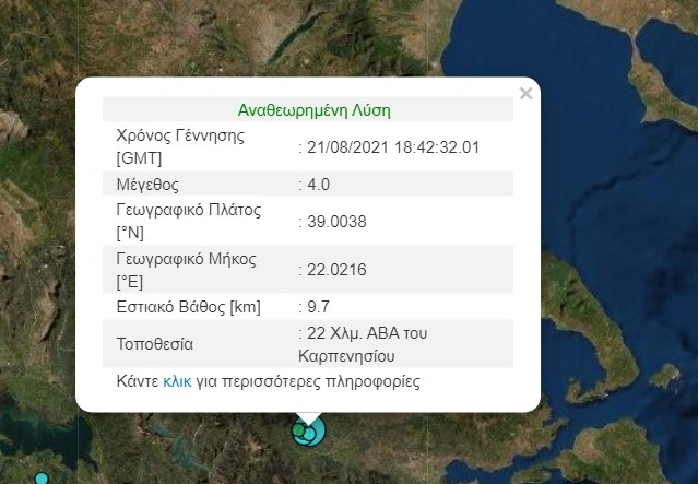 Σεισμική δόνηση μεγέθους 4 Ρίχτερ σημειώθηκε στο νομό Ευρυτανίας, 22 χιλιόμετρα ανατολικά, βορειοανατολικά του Καρπενησίου.