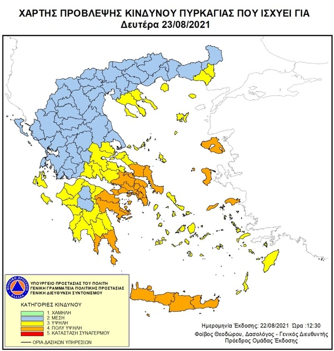 Σε γενική επιφυλακή παραμένουν και σήμερα, Δευτέρα 23 Αυγούστου όλες οι πυροσβεστικές υπηρεσίες της επικράτειας, καθώς, σύμφωνα με το Χάρτη Πρόβλεψης Κινδύνου Πυρκαγιάς, που εκδίδει η Γενική Γραμματεία Πολιτικής Προστασίας, προβλέπεται πολύ υψηλός κίνδυνος για φωτιά, με κατηγορία κινδύνου 4 για τις εξής περιοχές: