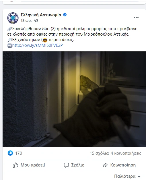 Μια άτυχη στιγμή είχαν οι διαχειριστές των social media της ΕΛ.ΑΣ. καθώς σε είδηση που ανέβασαν στο facebook για την εξιχνίαση υποθέσεων διάρρηξης στο Μαρκόπουλο Αττικής, έβαλαν φωτογραφία η οποία σύμφωνα με τους χρήστες είναι στιγμιότυπο από videogame! Σύμφωνα με τους χρήστες του διαδικτύου, το screenshot είναι από το παιχνίδι Thief Simulator VR.