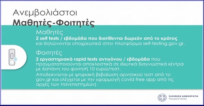 Στις 13 Σεπτεμβρίου αρχίζει ουσιαστικά η νέα σχολική χρονιά καθώς τότε είναι προγραμματισμένο να χτυπήσει το πρώτο κουδούνι και να επιστρέψουν οι μαθητές στα σχολεία. Όπως και στο τέλος της περσινής σεζόν, έτσι και τώρα οι μαθητές θα υποβάλλονται σε δύο self tests την εβδομάδα τα οποία θα παρέχονται δωρεάν. Τα αποτελέσματα δηλώνονται υποχρεωτικά στην πλατφόρμα self-testing.gov.gr.