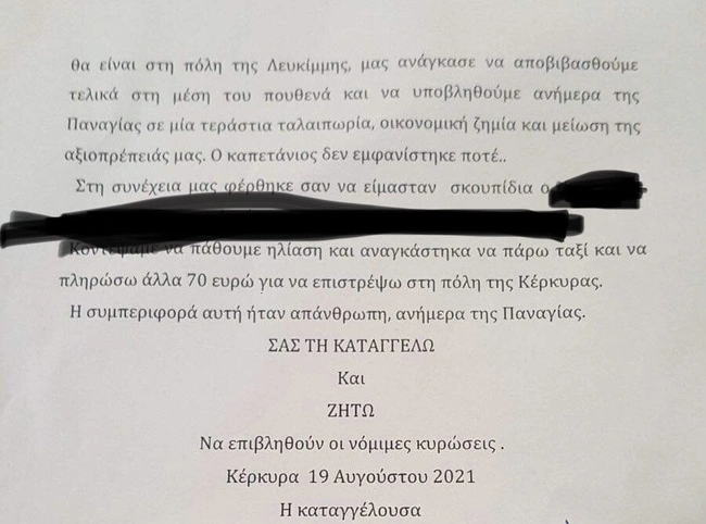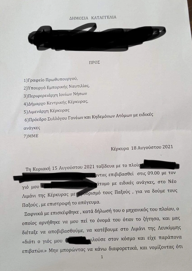 Η μητέρα καταγγέλλει πως ανήμερα της Παναγίας ταξίδευε με πλοίο από το Νέο Λιμάνι Κέρκυρας με προορισμό τους Παξούς και ξαφνικά την προσέγγισε ο -κατά δήλωσή του- μηχανικός του πλοίου και την «διέταξε» να αποβιβαστεί με το παιδί στο λιμάνι της Λευκίμμης... «Μας φέρθηκαν σαν να ήμασταν σκουπίδια» αναφέρει μεταξύ άλλων η μητέρα του παιδιού ΑμεΑ, προσθέτοντας ότι ο καπετάνιος ήταν άφαντος.