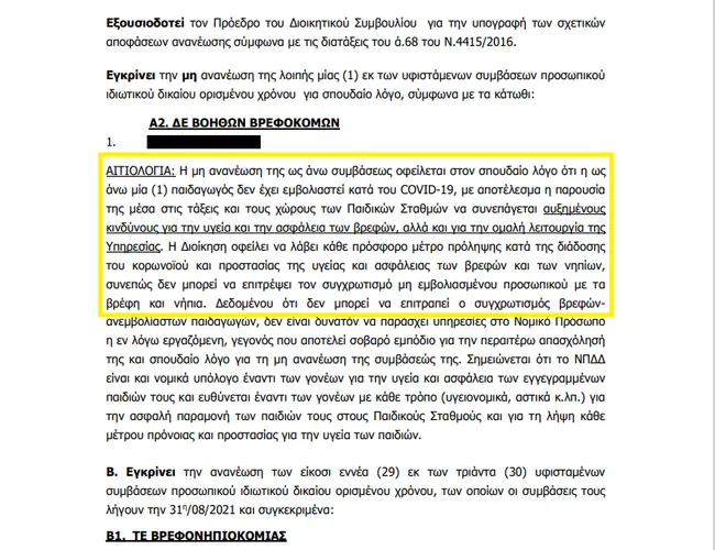 Ειδικότερα, με πρόσφατη απόφασή του ΝΠΔΔ, «Δημοτικοί Παιδικοί Σταθμοί Αλίμου», δεν ανανεώθηκαν οι συμβάσεις δύο εργαζομένων των ειδικοτήτων βοηθών βρεφονηπιοκόμων και βρεφονηπιοκόμων από τα συνολικά 47 άτομα, που απασχολούνται με σχέση ιδιωτικού δικαίου ορισμένου χρόνου σε δομές των παιδικών σταθμών. Οι συμβάσεις αυτές έληγαν στις 31 Ιουλίου και 31 Αυγούστου, αντίστοιχα. Το σκεπτικό της απόφασης, που υπογράφει ο δήμαρχος Αλίμου, Ανδρέας Κονδύλης, έχει ιδιαίτερο ενδιαφέρον αναφορικά με τον τρόπο, που θεμελιώνεται η αιτιολογία της μη ανανέωσης της σύμβασης υφιστάμενου προσωπικού λόγω του ότι δεν πραγματοποίησε, όπως όφειλε, τον εμβολιασμό του κατά του κορονοϊού.