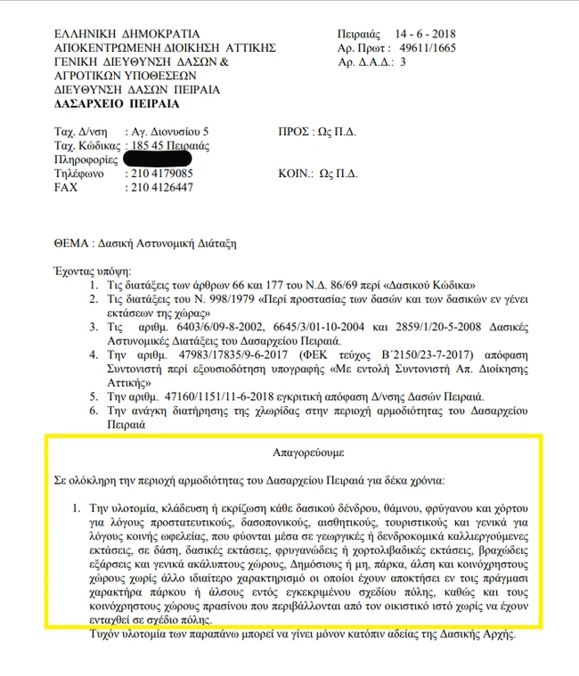 Από τον Ιούνιο του 2018 βρίσκεται σε ισχύ δασική αστυνομική διάταξη του δασαρχείου Πειραιά, βάσει της οποίας απαγορεύεται σε ολόκληρη την περιοχή αρμοδιότητάς του για 10 χρόνια η υλοτομία, κλάδευση ή εκρίζωση «κάθε δασικού δένδρου, θάμνου, φρύγανου και χόρτου για λόγους προστατευτικούς, δασοπονικούς, αισθητικούς, τουριστικούς και γενικά για λόγους κοινής ωφελείας». Η απαγόρευση αφορά σε δέντρα, θάμνους, φρύγανα και χόρτα, «που φύονται μέσα σε γεωργικές ή δενδροκομικά καλλιεργούμενες εκτάσεις, σε δάση, δασικές εκτάσεις, φρυγανώδεις ή χορτολιβαδικές εκτάσεις, βραχώδεις εξάρσεις και γενικά ακάλυπτους χώρους, δημόσιους ή μη, πάρκα, άλση και κοινόχρηστους χώρους χωρίς άλλο ιδιαίτερο χαρακτηρισμό, οι οποίοι έχουν αποκτήσει εν τοις πράγμασι χαρακτήρα πάρκου ή άλσους εντός εγκεκριμένου σχεδίου πόλης, καθώς και τους κοινόχρηστους χώρους πρασίνου που περιβάλλονται από τον οικιστικό ιστό χωρίς να έχουν ενταχθεί σε σχέδιο πόλης».