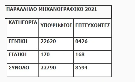 Παράλληλα ο συνολικός αριθμός των υποψηφίων με οριστικοποιημένο παράλληλο μηχανογραφικό φέτος ανήλθε σε 22.790, εκ των οποίων 20.810 υποψήφιοι είναι απόφοιτοι Λυκείων σχολικού έτους 2020-2021, ενώ 1.980 είναι απόφοιτοι παλαιότερων ετών. Επίσης, 170 υποψήφιοι επιλέχθηκαν στην ειδική κατηγορία, ενώ 22.620 επιλέχθηκαν στη γενική κατηγορία. Μετά την ολοκλήρωση της διαδικασίας έκδοσης αποτελεσμάτων, οι επιτυχόντες του παράλληλου μηχανογραφικού είναι συνολικά 8.594. Πιο συγκεκριμένα, οι 8.426 είναι επιτυχόντες στη γενική κατηγορία και 168 στην ειδική κατηγορία.