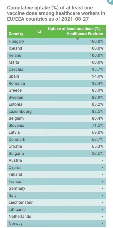 Μεταξύ των 17 χωρών που παρέχουν στοιχεία στο Ευρωπαϊκό Κέντρο Ελέγχου και Πρόληψης Νοσημάτων (ECDC) για τους εμβολιασμούς υγειονομικών, με ποσοστό 83,9% να έχουν λάβει τουλάχιστον μία δόση (80% για τους πλήρους εμβολιασμένους), η Ελλάδα βρίσκεται στο ίδιο επίπεδο με τη Σουηδία και προηγείται της Εσθονίας (83,2%), του Λουξεμβούργου (82,5%), του Βελγίου (80,4%), της Σλοβενίας (71,5%), της Λετονίας (69%), της Δανίας (68,7%), της Κροατίας (68,5%) και της Βουλγαρίας, η οποία εμφανίζει μακράν το χαμηλότερο ποσοστό (23,5%).