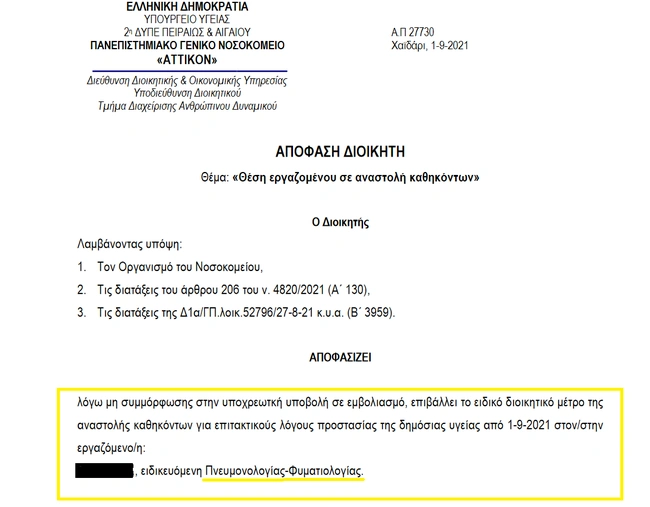 Ανεμβολίαστοι πνευμονολόγοι εξέταζαν περιστατικά Covid, ανεμβολίαστοι διευθυντές ακτινοδιαγνωστικής γνωμάτευαν ακτινογραφίες ασθενών με κορονοϊό, ανεμβολίαστοι νευροχειρουργοί έκαναν επεμβάσεις και ανεμβολίαστοι γιατροί όλων των ειδικοτήτων παρείχαν υγειονομικές υπηρεσίες σε όλα τα δημόσια νοσοκομεία της χώρας θέτοντας σε κίνδυνο την υγεία των ασθενών τους. Η εφαρμογή του διοικητικού μέτρου της αναστολής εργασίας βρίσκει σημαντικό τμήμα του υγειονομικού προσωπικού της χώρας εκτός ΕΣΥ, καθώς δεν ανταποκρίθηκαν στον υποχρεωτικό εμβολιασμό τους.