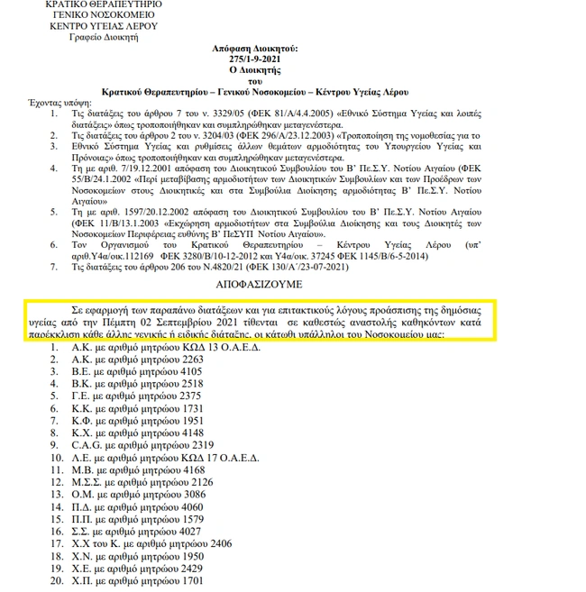 Οι παραινέσεις του υπουργείου Υγείας αλλά και των ειδικών επιστημόνων προς τους ανεμβολίαστους υγειονομικούς να προσέλθουν ακόμα και την ύστατη στιγμή στα εμβολιαστικά κέντρα δεν εισακούστηκαν. Στο πλαίσιο αυτό, δεν προσκόμισαν ούτε ψηφιακό πιστοποιητικό εμβολιασμού Covid-19 ολοκλήρωσης εμβολιασμού, ούτε ψηφιακό πιστοποιητικό εμβολιασμού λήψης πρώτης δόσης του εμβολιασμού, ούτε και βεβαίωση θετικού διαγνωστικού ελέγχου και για διάστημα ελέγχου 6 μηνών από τη νόσηση.