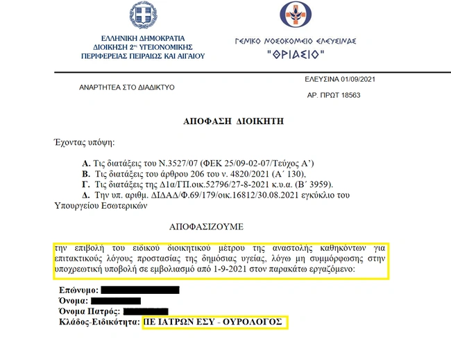 Πέρασαν περισσότεροι από 2 μήνες από τη δημοσίευση στην Εφημερίδα της Κυβερνήσεως του Ν.4820/202, βάσει του οποίου καθοριζόταν η υποχρεωτικότητα του εμβολιασμού αλλά και η επιβολή, κατά παρέκκλιση κάθε άλλης γενικής ή ειδικής διάταξης, του ειδικού διοικητικού μέτρου της αναστολής καθηκόντων για επιτακτικούς λόγους προστασίας της δημόσιας υγείας, χωρίς την καταβολή αποδοχών.