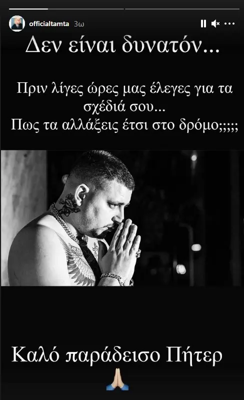 «Δεν είναι δυνατόν.. Πριν λίγες ώρες μας έλεγες για τα σχέδια σου… Πώς τα άλλαξες έτσι στο δρόμο;;; Καλό παράδεισο Πήτερ» έγραψε χαρακτηριστικά η Τάμτα στα social media.