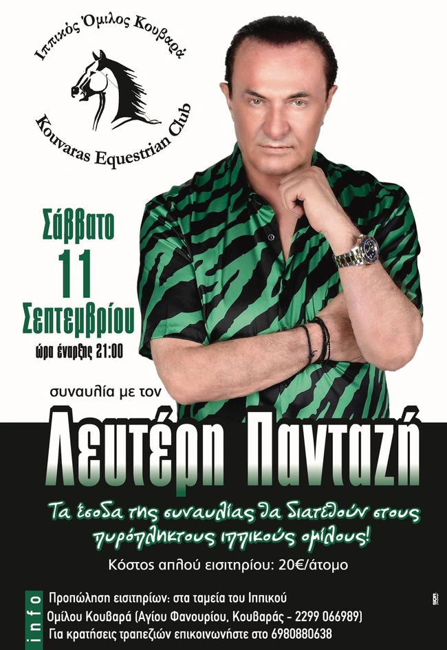 Συναυλία με φιλανθρωπικό σκοπό στον ιππικό όμιλο Κουβαρά θα δώσει ο Λευτέρης Πανταζής. Η συναυλία θα πραγματοποιηθεί το Σάββατο (11/9) στις 21:00 και τα έσοδα θα διατεθούν στους πυρόπληκτους ιππικούς ομίλους.