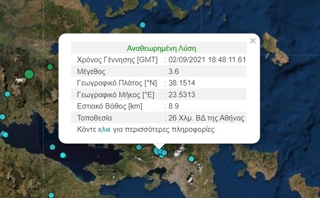 Σεισμός μεγέθους 3,6 βαθμών της κλίμακας Ρίχτερ «ταρακούνησε» την Αττική το βράδυ της Πέμπτης (2/9) στις 21:48, ενώ έγινε ιδιαίτερα αισθητός σε πολλές περιοχές της Αθήνας. Σύμφωνα με το Γεωδυναμικό Ινστιτούτο ο σεισμός σημειώθηκε 26χλμ βορειοδυτικά από την Αθήνα ενώ είχε εστιακό βάθος 8,9 χλμ. Αξίζει να σημειωθεί πως νωρίτερα σήμερα είχαν σημειωθεί δυο ασθενέστερες σεισμικές δονήσεις στην ίδια περιοχή μεγέθους 2,3 και 3,1 Ρίχτερ.