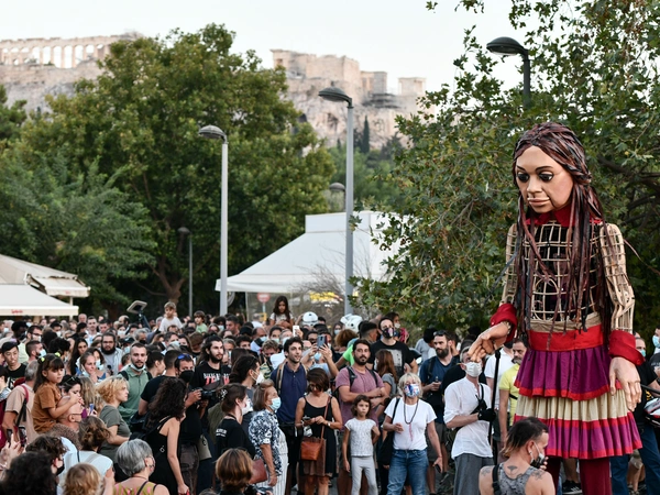Υπό τους ήχους του τραγουδιού «Άσμα Ασμάτων» του Μίκη Θεοδωράκη και του Ιάκωβου Καμπανέλλη η προσφυγοπούλα «Αμάλ» από τη Συρία περπάτησε σήμερα στο κέντρο της Αθήνας με συνοδοιπόρους τους πολλούς μικρούς και μεγάλους. Πλήθος κόσμου, τηρώντας τα μέτρα προστασίας για την Covid-19, συγκεντρώθηκε στην πλατεία Ασωμάτων στο Μοναστηράκι και συνόδευσε την μαριονέτα με ύψος 3,5 μέτρα που διανύει ένα μεγάλο ταξίδι 8.000 χιλιομέτρων με τελικό προορισμό το Μάντσεστερ στην Αγγλία.