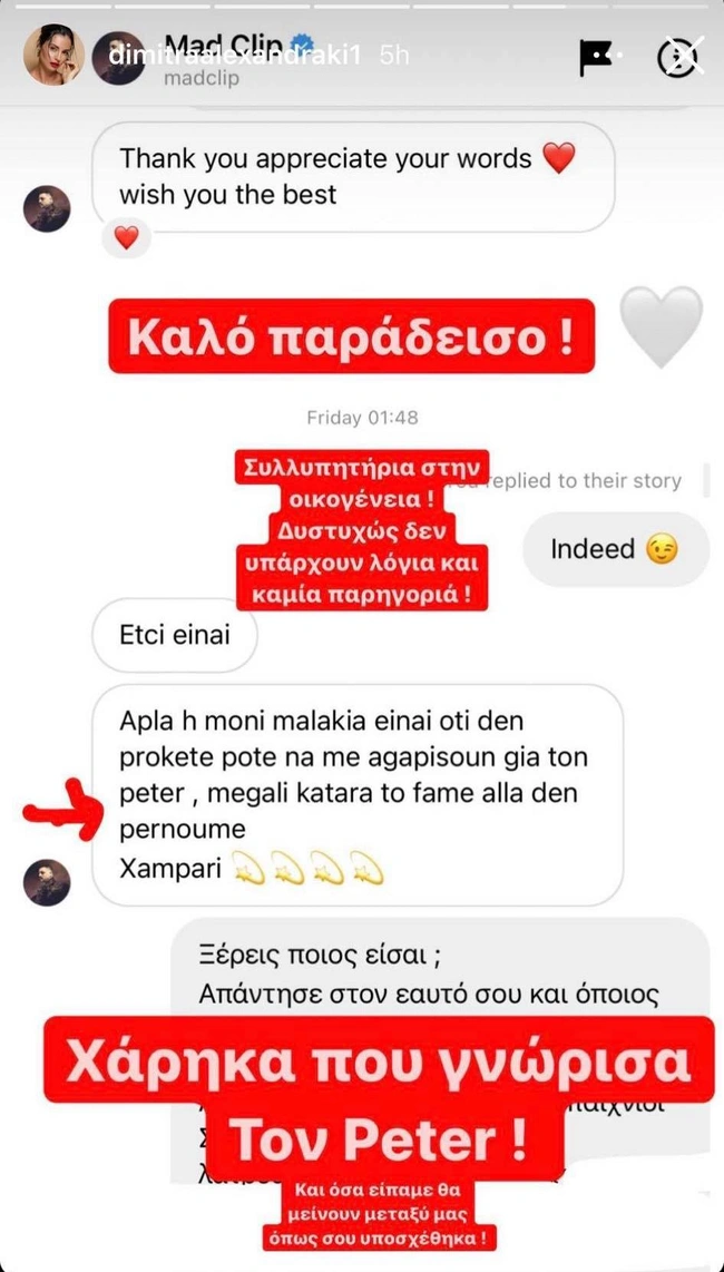 «Την Παρασκευή σου είπα απλά ζήσε! Καλό Παράδεισο! Συλλυπητήρια στην οικογένεια! Δυστυχώς δεν υπάρχουν λόγια και καμιά παρηγοριά! Χάρηκα που γνώρισα τον Peter! Και όσα είπαμε θα μείνουν μεταξύ μας όπως σου υποσχέθηκα!», έγραψε χαρακτηριστικά, δημοσιεύοντας παράλληλα μέρος των μηνυμάτων που είχαν ανταλλάξει μία εβδομάδα πριν.