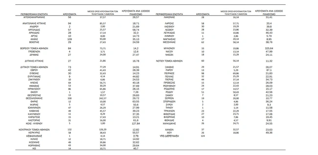 Tα κρούσματα στις περιφερειακές ενότητες που ανήκουν στην Αττική: