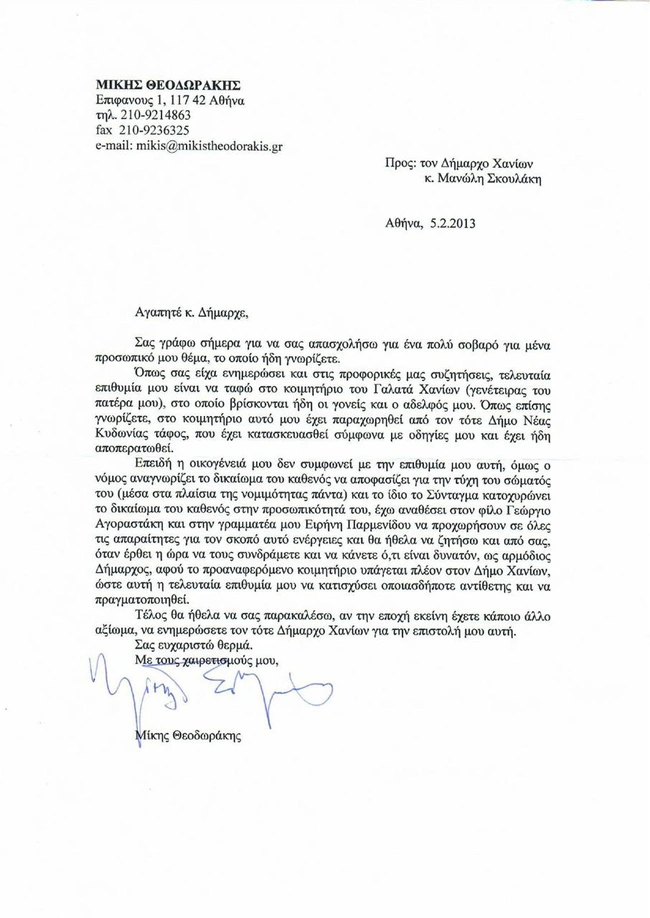 «Θα ήθελα να ζητήσω και από εσάς, όταν έρθει η ώρα να τους συνδράμετε και να κάνετε ό,τι είναι δυνατόν, ως αρμόδιος δήμαρχος, αφού το προαναφερόμενο κοιμητήριο υπάγεται πλέον στον δήμο Χανίων, ώστε αυτή η τελευταία επιθυμία μου να κατισχύσει οποιασδήποτε αντίθετης και να πραγματοποιηθεί», σημείωνε ο Μίκης Θεοδωράκης στην επιστολή του.