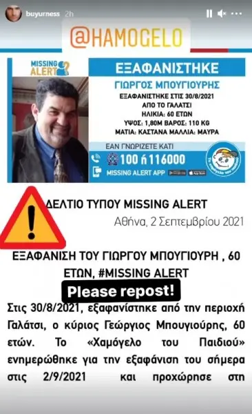 Σύμφωνα με επίσημη ανακοίνωση από το Χαμόγελο του Παιδιού, «η περιπέτεια του Μπουγιούρη Γεώργιου, 60 ετών, έληξε σήμερα στις 04/09/2021 δίνοντας τέλος στην αγωνία των δικών του ανθρώπων που τον αναζητούσαν. Καθοριστικό ρόλο, στην εύρεση του κύριου Μπουγιούρη, έπαιξε πολίτης που δουλεύει σε περίπτερο στην περιοχή του Γαλατσίου. Ο ευαισθητοποιημένος πολίτης είδε, κατά τις πρωινές ώρες, τον κύριο Μπουγιούρη σε άσχημη κατάσταση και ενημέρωσε άμεσα το ΕΚΑΒ, με το οποίο και διεκομίσθη σε εφημερεύον νοσοκομείο. Ο κύριος Μπουγιούρης θα λάβει όλη την απαραίτητη φροντίδα την οποία και χρειάζεται. «To Χαμόγελο του Παιδιού» θα βρίσκεται κοντά στον Μπουγιούρη Γεώργιο και την οικογένειά του για οτιδήποτε χρειαστεί».
