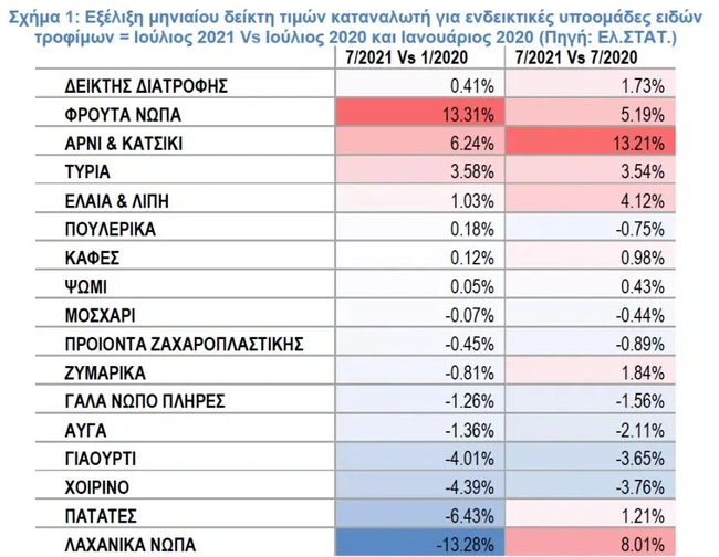 Όσον αφορά επιμέρους ομάδες τροφίμων, η μεγαλύτερη αύξηση καταγράφεται στα νωπά φρούτα κατά 13,31% και στο αρνί και κατσίκι κατά 6,24%. Όσον αφορά τις τιμές των φρούτων, αυτές είναι αυξημένες λόγω των καιρικών συνθηκών του φετινού καλοκαιριού, ενώ οι τιμές του αρνιού παραμένουν αυξημένες λόγω της προσφοράς και ζήτησης το φετινό Πάσχα. Οι ομάδες των νωπών λαχανικών έχουν μεν αρκετά χαμηλότερες τιμές σε σχέση με τον Ιανουάριο του 2020 κατά 13,28%, αλλά συγκριτικά με τον Ιούλιο 2020 είναι και αυτές αυξημένες κατά 8,01%. Οι υπόλοιπες ομάδες καταγράφουν μικρότερες διακυμάνσεις με σαφή όμως την επίδραση των αυξήσεων των διεθνών τιμών πρώτων υλών.