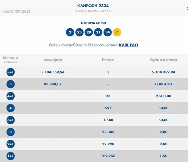 Οι τυχεροί αριθμοί που που ανέδειξε η κληρωτίδα του ΟΠΑΠ είναι: 2, 23, 29, 31, 34 και Τζόκερ το 7. Tυχερός νικητής δεν υπήρξε στη δευτερη κατηγορία ενώ στην τρίτη (4+1) βρέθηκαν 33 τυχερά δελτία που θα πάρουν από 2.500 ευρώ.