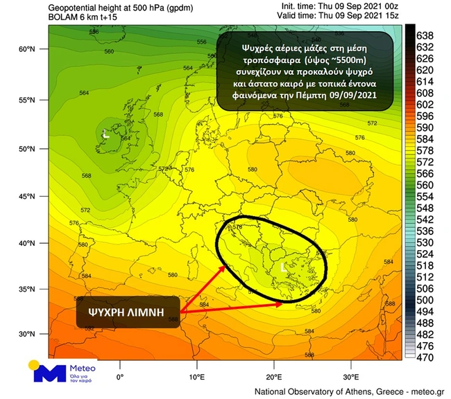 Οι ψυχρές αέριες μάζες στη μέση τροπόσφαιρα, που με τη μορφή «ψυχρής λίμνης» εντοπίζονται πάνω από την Ελλάδα και την Ιταλία, αναμένεται να συνεχίσουν να επηρεάζουν τον καιρό της χώρας μας την Πέμπτη 9 Σεπτεμβρίου, σύμφωνα με τα προγνωστικά στοιχεία του Εθνικού Αστεροσκοπείου Αθηνών/meteo.gr, . Πέραν των χαμηλών για την εποχή θερμοκρασιών, βροχές και καταιγίδες θα εκδηλωθούν σε αρκετές περιοχές, με τα φαινόμενα να είναι τοπικά έντονα. Στον προγνωστικό χάρτη που ακολουθεί, αποτυπώνεται ο εκτιμώμενος αθροιστικός υετός κατά τη διάρκεια της Πέμπτης.