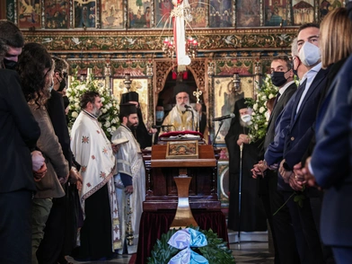 Το αυτοκίνητο που μετέφερε τη σορό του έφτασε στις 12:50 στον Γαλατά, που απέχει περίπου 6-7 χιλιόμετρα από τα Χανιά όπου ψάλλεται η εξόδιος ακολουθία στον Ιερό Ναό Αγίου Νικολάου κι εν συνεχεία θα ταφεί στο νεκροταφείο του χωριού. Σε όλη τη διαδρομή υπήρχαν πολίτες και στις δυο πλευρές του δρόμου, αποτίοντας φόρο τιμής στον σπουδαίο μουσικοσυνθέτη πετώντας λουλούδια, χειροκροτώντας και σκύβοντας με σεβασμό το κεφάλι... Εξω από τον Ι.Ν. τον υποδέχθηκαν οι συγγενείς του, λιγοστοί φίλοι και κάτοικοι του χωριού, που έχει ντυθεί με μαύρα πανιά για τον Μίκη Θεοδωράκη.