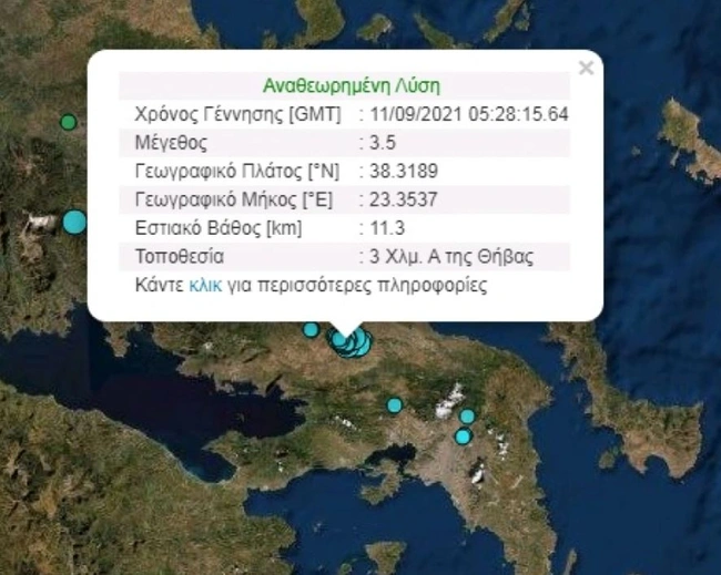 Σεισμός στην Θήβα λίγο πριν τις 8:30 το πρωί του Σαββάτου και μάλιστα δυο φορές, μέσα σε χρονική διάρκεια μικρότερη των 30 δευτερολέπτων. Συγκεριμένα, η πρώτη δόνηση μεγέθους 3 Ρίχτερ σημειώθηκε στις 8:27:48 στα 3 χιλιόμετρα ανατολικά-βορειοανατολικά της Θήβας και με εστιακό βάθος 13,3 χιλιομέτρων.