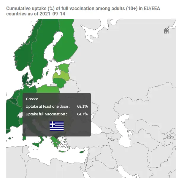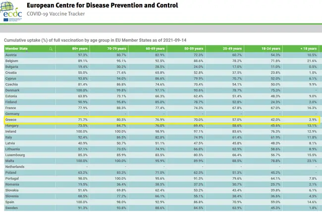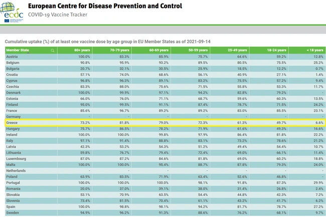 Στην 18η θέση μεταξύ των 27 κρατών-μελών της Ευρωπαϊκής Ενωσης βρίσκεται η Ελλάδα αναφορικά με το ποσοστό των πλήρως εμβολιασμένων ενήλικων πολιτών της. Η συγκριτική αυτή κατάταξη, βάσει των επίσημων στατιστικών στοιχείων του Ευρωπαϊκού Κέντρου Πρόληψης και Ελέγχου Νόσων(ECDC), αποτυπώνει πλήρως την κάμψη της εμβολιαστικής διαδικασίας στη χώρα μας, καθώς στα μέσα Σεπτεμβρίου η πλήρης εμβολιαστική κάλυψη του ενήλικου πληθυσμού είναι της τάξης του 64,7%.