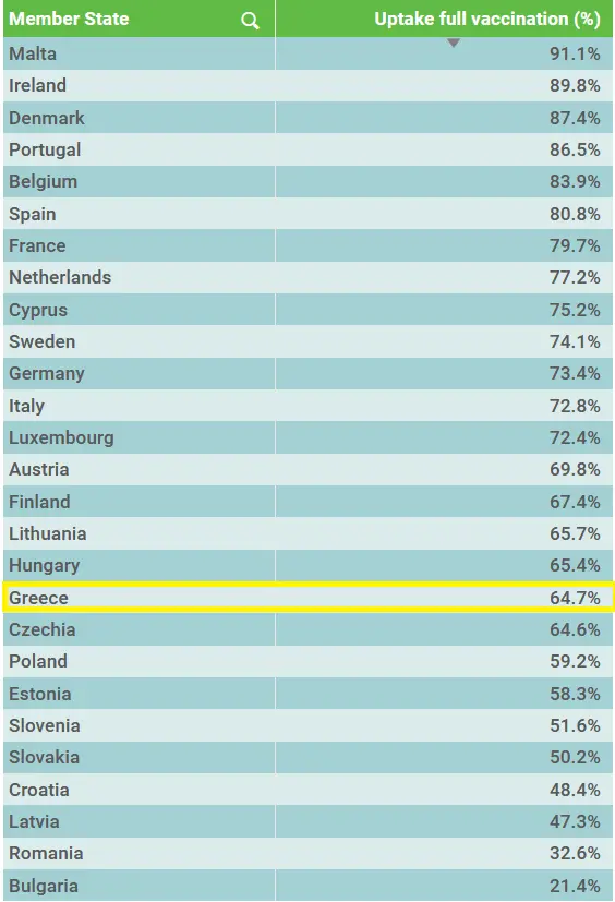 Η εμβολιαστική επίδοση της Ελλάδας (64,7%) την κατατάσσει στην 18η θέση ενώ την 19η καταλαμβάνει η Τσεχία με το 64,6% του πληθυσμού της να είναι πλήρως εμβολιασμένο. Η τελευταία 8άδα διαμορφώνεται ως εξής: