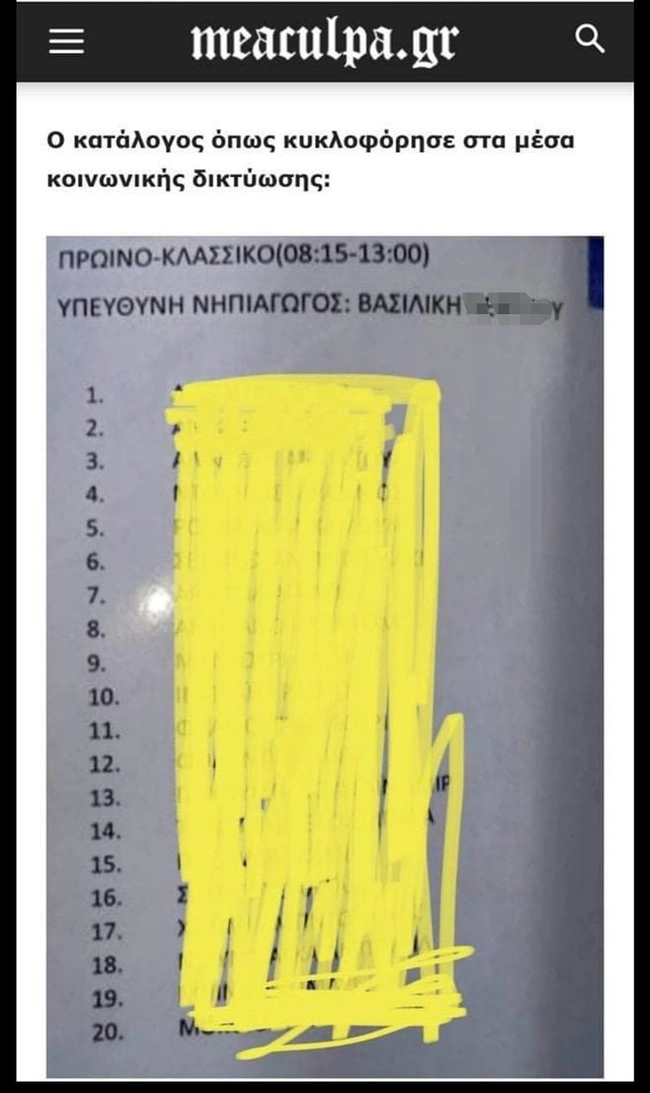 Συγκεκριμένα, η ιστοσελίδα meaculpa.gr δημοσίευσε χθες Τρίτη, έναν κατάλογο με ονόματα μαθητών νηπιαγωγείου και του ονόματος της δασκάλας τους. Η εν λόγω λίστα χαρακτηρίστηκε από το σάιτ ως «σοκαριστική» και ότι αναδεικνύει, σύμφωνα πάντα με το άρθρο, το «οξύ δημογραφικό και κοινωνικό πρόβλημα που δημιουργεί το μεταναστευτικό στην ελληνική πρωτεύουσα». Στο δημοσίευμα μάλιστα επισημαινόταν ότι ο βουλευτής της ΝΔ, Κωνσταντίνος Μπογδάνος, είναι από τις «ελάχιστες εξαιρέσεις» βουλευτών που ασχολείται με το ζήτημα, με τον ίδιο να κάνει retweet το επίμαχο άρθρο.