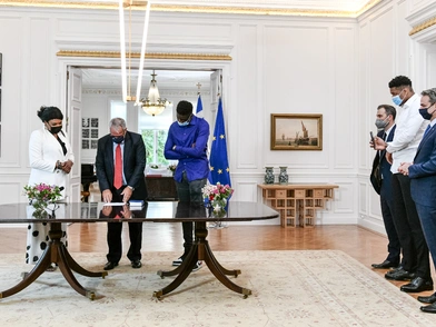 Στο Μέγαρο Μαξίμου βρέθηκε το απόγευμα της Πέμπτης ο σπουδαίος άσος του NBA, Γιάννης Αντετοκούνμπο για να παρακολουθήσει από κοντά την τελετή ορκωμοσίας της μητέρας του Βερόνικα, και του αδερφού του, Αλέξανδρου, οι οποίοι πολιτογραφήθηκαν Ελληνες. Παρουσία του Κυριάκου Μητσοτάκη έγινε η ορκωμοσία της Βερόνικας Αντετοκούνμπο και του γιου της Άλεξ οι οποίοι πολιτογραφήθηκαν τιμητικά Έλληνες. Μαζί τους ήταν και ο Greek Freak, ο οποίος παρακολούθησε την τελετή στο πλευρό το πρωθυπουργού.