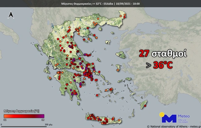 Σύμφωνα με καταγραφές στο δίκτυο αυτόματων μετεωρολογικών σταθμών του Εθνικού Αστεροσκοπείου Αθηνών/meteo.gr, η μέγιστη θερμοκρασία ξεπέρασε τους 36 βαθμούς Κελσίου σε 27 σταθμούς. Στον χάρτη που ακολουθεί παρουσιάζονται οι σταθμοί του Εθνικού Αστεροσκοπείου Αθηνών/meteo.gr όπου η μέγιστη θερμοκρασία ξεπέρασε τους 32 βαθμούς Κελσίου.
