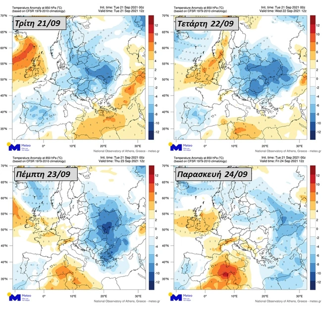 Οι ψυχρές αέριες μάζες που βρίσκονται στην Κεντρική Ευρώπη (μπλε αποχρώσεις) την Τετάρτη 22/9 θα κινηθούν νοτιότερα και θα επηρεάσουν τα κεντρικά και βόρεια τμήματα (χάρτης πάνω δεξιά), ενώ την Πέμπτη 23/9 το μεγαλύτερο τμήμα της χώρας μας θα βρίσκεται υπό την επίδραση των ψυχρών αέριων μαζών, με αποτέλεσμα τη σημαντική πτώση της θερμοκρασίας, όπου θα κυμαίνεται έως και 9 βαθμούς κάτω από τα φυσιολογικά για την εποχή επίπεδα (χάρτης κάτω αριστερά).