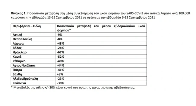 Πτωτικές ή σταθεροποιητικές τάσεις, στο μέσο εβδομαδιαίο ιικό φορτίο του κορονοϊού στα αστικά λύματα όλων των περιοχών που ελέγχθηκαν από το Εθνικό Δίκτυο Επιδημιολογίας Λυμάτων (ΕΔΕΛ) του ΕΟΔΥ, παρατηρήθηκαν την εβδομάδα από 13 έως 19 Σεπτεμβρίου, σε σχέση με την εβδομάδα από 6 έως 12 Σεπτεμβρίου 2021.