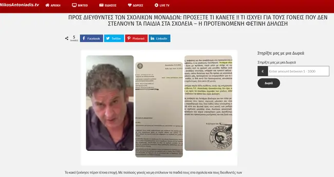 Οπως αναφέρει ο Νίκος Αντωνιάδης, ο οποίος είναι συνήγορος του καρδιολόγου Φαίδωνα Βόβολη ενώπιον του πειθαρχικού συμβουλίου του Ιατρικού Συλλόγου Αθηνών, όπου ελέγχεται για διοργάνωση συγκεντρώσεων κατά του εμβολιασμού, «ΚΑΚΩΣ - ΚΑΚΙΣΤΑ κάποιοι γονείς καταθέτουν μηνύσεις, επειδή αυτοί δεν επιτρέπουν στα παιδιά τους την είσοδο στο σχολείο χωρίς μάσκα ή χωρίς τεστ. Πόσες φορές θα το πω; Οι εκπαιδευτικοί ΕΦΑΡΜΟΖΟΥΝ ΤΙΣ Κ.Υ.Α !! ΔΕΝ ΝΟΜΙΜΟΠΟΙΕΙΣΤΕ να τους μηνύσετε!!», συνεχίζοντας ως εξής: