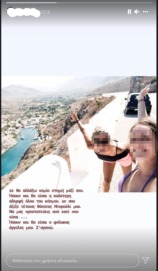 Απαρηγόρητη η μικρότερη αδερφή του θύματος και μη μπορώντας να διαχειριστεί το πένθος της, δεν άντεξε και έστειλε το τελευταίο «αντίο» μέσω του λογαριασμού της στο Instagram. «Δεν θα αλλάξω καμία στιγμή μαζί σου. Ήσουν και θα είσαι η καλύτερη αδερφή του κόσμου. Δεν σου άξιζε τέτοιος θάνατος Ντορούλι μου. Να μας προστατεύεις από εκεί που είσαι. Ήσουν και θα είσαι ο φύλακας άγγελός μου. Σ' αγαπώ».