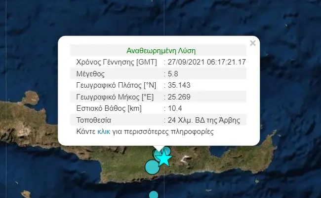 Ισχυρότατος σεισμός 5,8 Ρίχτερ σημειώθηκε στις 09:17, 23 χιλιόμετρα βορειοδυτικά της πόλης της Αρβης στο Ηράκλειο Κρήτης, όπως ανακοίνωσε το Γεωδυναμικό Ινστιτούτο, με τη δόνηση να έχει εστιακό βάθος μόλις δέκα χιλιομέτρων. Υπάρχουν ζημιές σε κτίρια στο Αρκαλοχώρι, ενώ υπάρχουν πληροφορίες και για δύο εγκλωβισμένους.