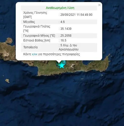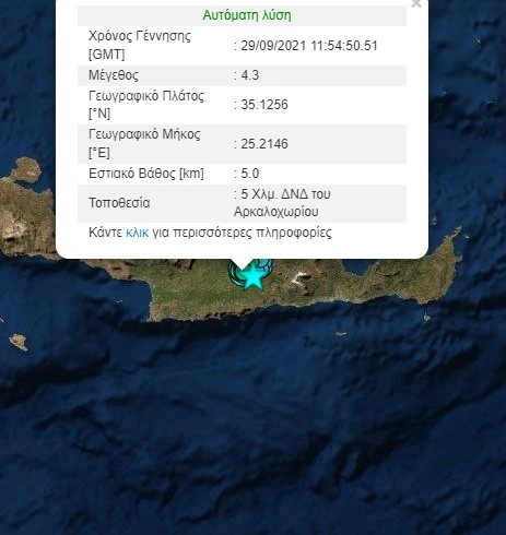 Πλούσια είναι η μετασεισμική ακολουθία στο Ηράκλειο Κρήτης μετά τον ισχυρό σεισμό των 5,8 Ρίχτερ. Δύο σεισμικές ακολουθίες με διαφορά δευτερολέπτων ταρακούνησαν το Αρκαλοχώρι το μεσημέρι της Τετάρτης 29 Σεπτεμβρίου 2021.