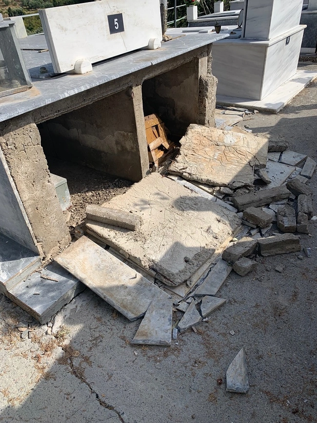 Εικόνες καταστροφής και σε κοιμητήριο στην Καλλονή του Δήμου Αρχανών - Αστερουσιών, μετά από τον σεισμό στην Κρήτη που «χτύπησε» την περασμένη Δευτέρα αλλά και τους ισχυρού μετασεισμούς που ακολούθησαν. Οι ζημιές είναι πολλές στα κτήρια και οικήματα, ενώ από τη «μανία» της φύσης δεν γλίτωσαν ούτε νεκροταφεία στην περιοχή.