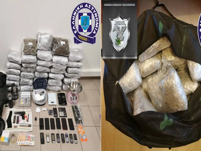 Στο σπίτι τους βρέθηκαν και κατασχέθηκαν μεταξύ άλλων δέματα ακατέργαστης κάνναβης 35 κιλών, δέματα κοκαΐνης 960 γραμμαρίων, ζυγαριές, υλικά συσκευασίας και επεξεργασίας, 14 κινητά τηλέφωνα και 17 πακέτα σύνδεσης κινητής τηλεφωνίας.